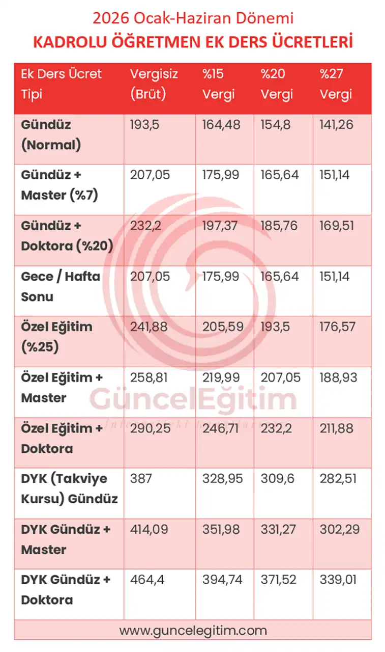 2026 yılı öğretmen ve idarecilerin vergi dilimlerine göre ek ders ücretleri –