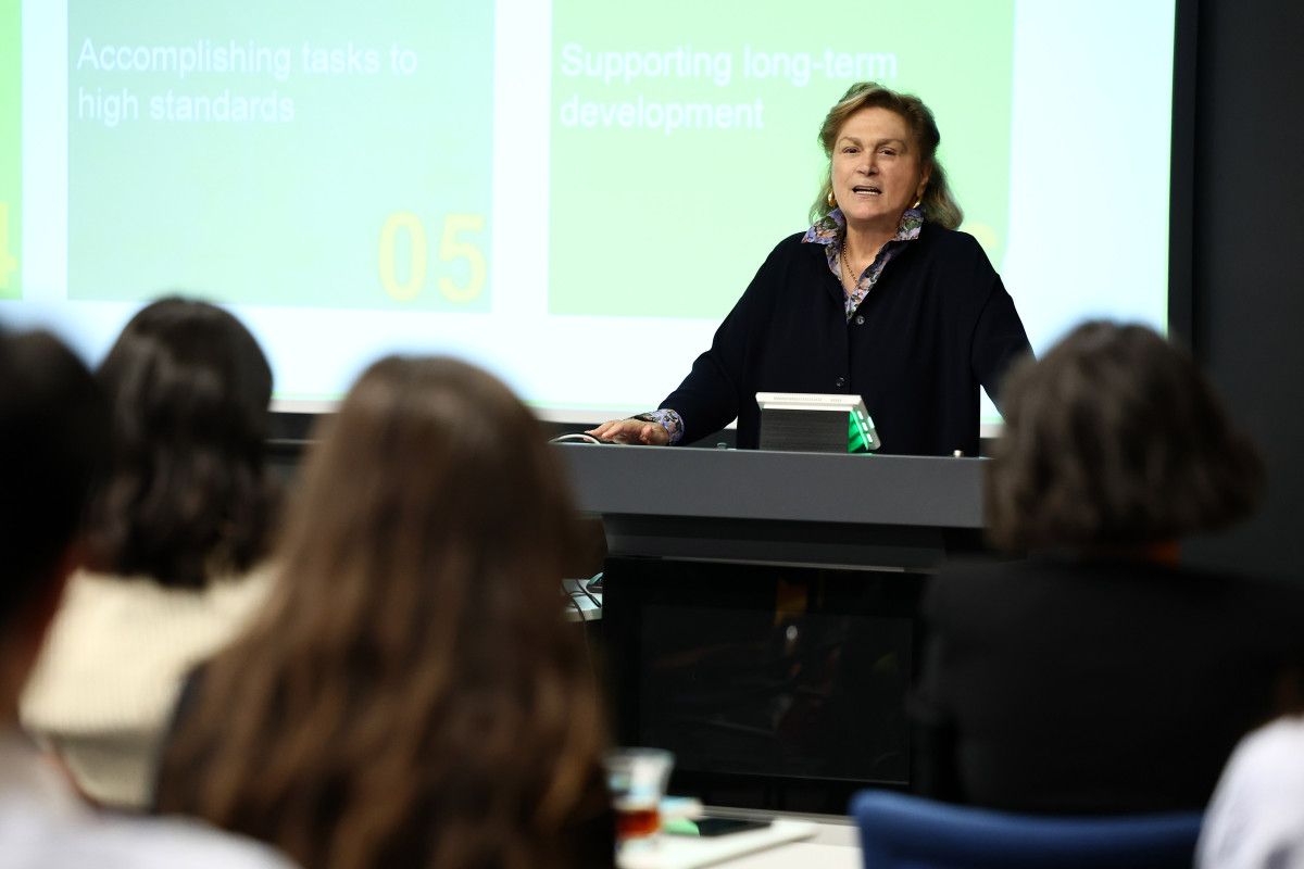 Yüksek lisans öğrencilerinin ilgiyle takip ettiği konuşmasında liderliğin geliştirilebilir bir beceri olduğunu vurgulayan Güler Sabancı, Sabancı Üniversitesi’nin kuruluş sürecinin kendisine, “Daha çok dinleme, gerektiğinde bir adım geride durma ve tartışmaların olgunlaşmasını bekleme” becerilerini kazandırdığını belirtti.